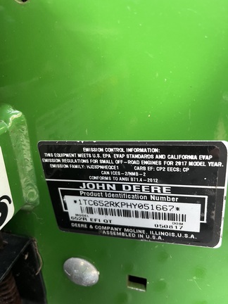 The 2017 John Deere 652R is a commercial-grade stand-on mower designed for professional landscapers and property owners seeking efficiency and durability. It is equipped with a 23.5-horsepower Kawasaki FX730V engine, providing robust power for demanding mowing tasks. The mower features a 52-inch Mulch On Demandâ„¢ deck with an electric operator-controlled discharge chute, allowing for versatile mowing options. Used, AS IS