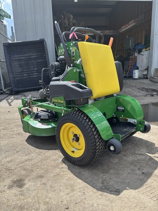 The John Deere Q810E has 19-hp (14.2-kW), a 36" 7-gauge fabricated deck and it mows up to 8 mph.