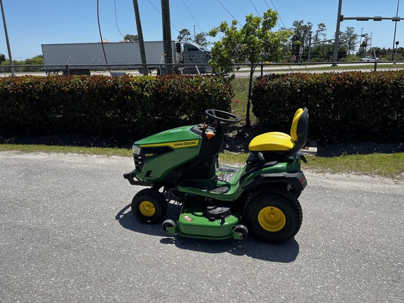 The John Deere S240 Lawn Tractor with 48-in. Accel Deep Mower features a 21.5 hp V-twin gasoline engine and a 48-inch Accel Deep mower deck. It uses a hydrostatic transmission with side-by-side pedals and electric PTO engagement. Cutting height is adjustable, and the deck design improves airflow for consistent cut quality. The tractor includes a high-back seat, 3-gallon fuel tank, and compatibility with multiple attachments.
