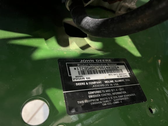 The John Deere Z950R is a commercial-grade zero-turn mower designed for professional landscapers and large property owners seeking durability and performance. Equipped with a 27-hp (20.1-kW) Kawasaki FX850V engine, it offers robust power for demanding mowing tasks. The mower features a 60-inch 7-Iron™ PRO side-discharge deck, known for its exceptional cut quality and durability. For operator comfort, it includes a high-back seat with armrests and a premium suspension system.