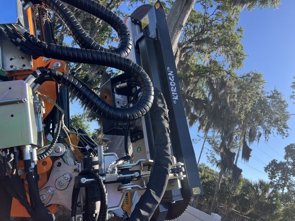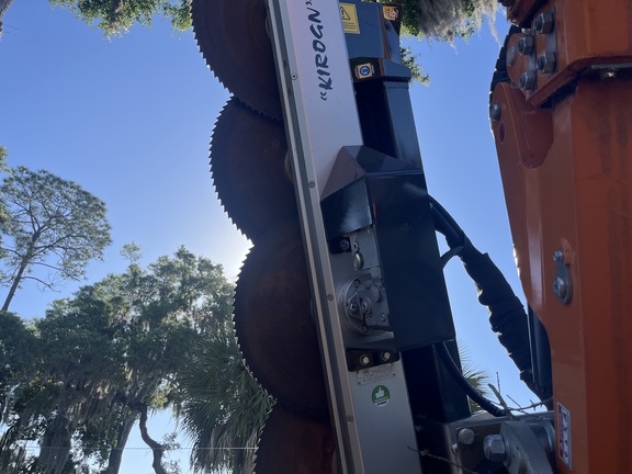 The Energreen 45° Angle Saw Bar is a hydraulic boom-mounted cutting attachment designed for roadside and forestry maintenance. It features a high-strength steel frame with 2–5 tempered steel cutting discs ranging from 24–35 inches in diameter. Working width varies from approximately 43 to 103 inches, with a cutting capacity up to 6 inches in diameter. The bar is powered by a hydraulic gear motor with belt drive and offers hydraulic tilt adjustment, including 45-degree angle positioning for cutting at multiple angles.