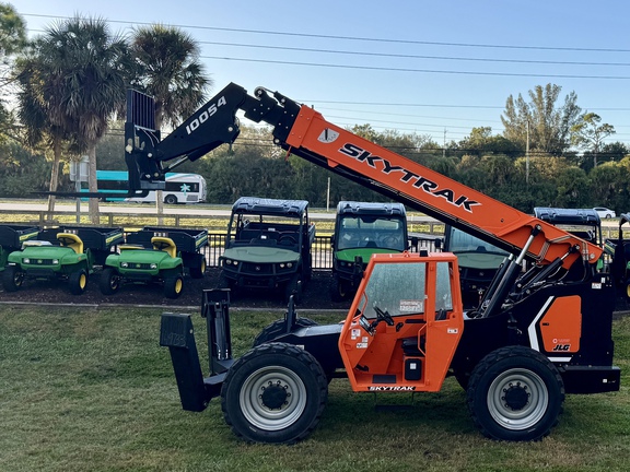 JLG 10054 SkyTrak telehandler is a 10,000-lb capacity, rough-terrain lift built for serious material handling on construction sites. With a max lift height of 54 ft and forward reach over 40 ft, it places pallets, trusses, and materials where cranes can’t easily go. Four-wheel drive, four-wheel steer, and a powershift transmission help it climb mud, ruts, and uneven ground. A spacious cab with intuitive single-joystick control improves operator comfort and precision. Auxiliary hydraulics support a range of attachments, making the 10054 a versatile pick-and-place machine for framing, masonry, and general jobsite work.