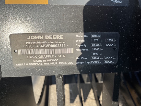 The John Deere GR84B Rock Grapple is a heavy-duty attachment designed for efficient handling of rocks, debris, and brush. Built with durable steel construction, it provides strong gripping power and precise control for loaders and skid steers. The GR84B’s robust design ensures reliable performance in landscaping, construction, and farm applications. Its operator-friendly controls allow for safe and efficient material handling, making it ideal for clearing, loading, and transporting rocks and other bulky materials. This attachment maximizes productivity while maintaining durability and versatility on the job.