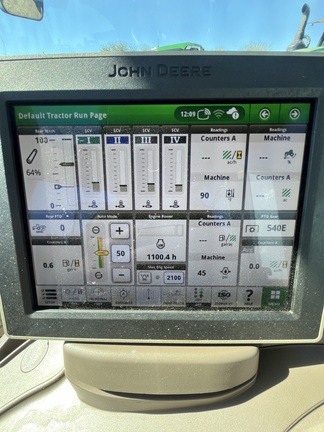 John Deere 6R 120 Premium Cab tractor delivers 120-hp class performance with a 24F/24R AutoQuad Plus powershift transmission for efficient field and road work. Standard cab with cab suspension, panorama doors, panorama glass roof, manual telescopic mirrors, and standard radio provides a comfortable, high-visibility operator environment. A 114 L/min hydraulic pump feeds four electronic SCVs and a Cat 3N 3-point hitch. Rear PTO with 540E/1000/1000E speeds, rack-and-pinion rear axle, 4WD front axle, and 320/90R42 rear / 320/85R28 front tires round out a versatile mid-frame 6R spec.